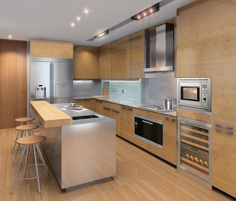 Tủ bếp được sử dụng gỗ Veener cũng bắt nguồn từ đó. Nguyên liệu chủ yếu để gia công tủ bếp công nghiệp dán Veener thường dùng là gỗ tấm MDF cốt xanh chống ẩm, hoặc gỗ tấm tự nhiên ghép thanh.Tuy nhiên, dòng MDF cốt xanh vẫn chiếm nhiều ưu thế hơn cả về co giãn, chịu lực, cũng như liên kết đã được xử lí cơ học 100%, làm giảm tối đa cong vênh co ngót tự nhiên, chịu lực tốt.